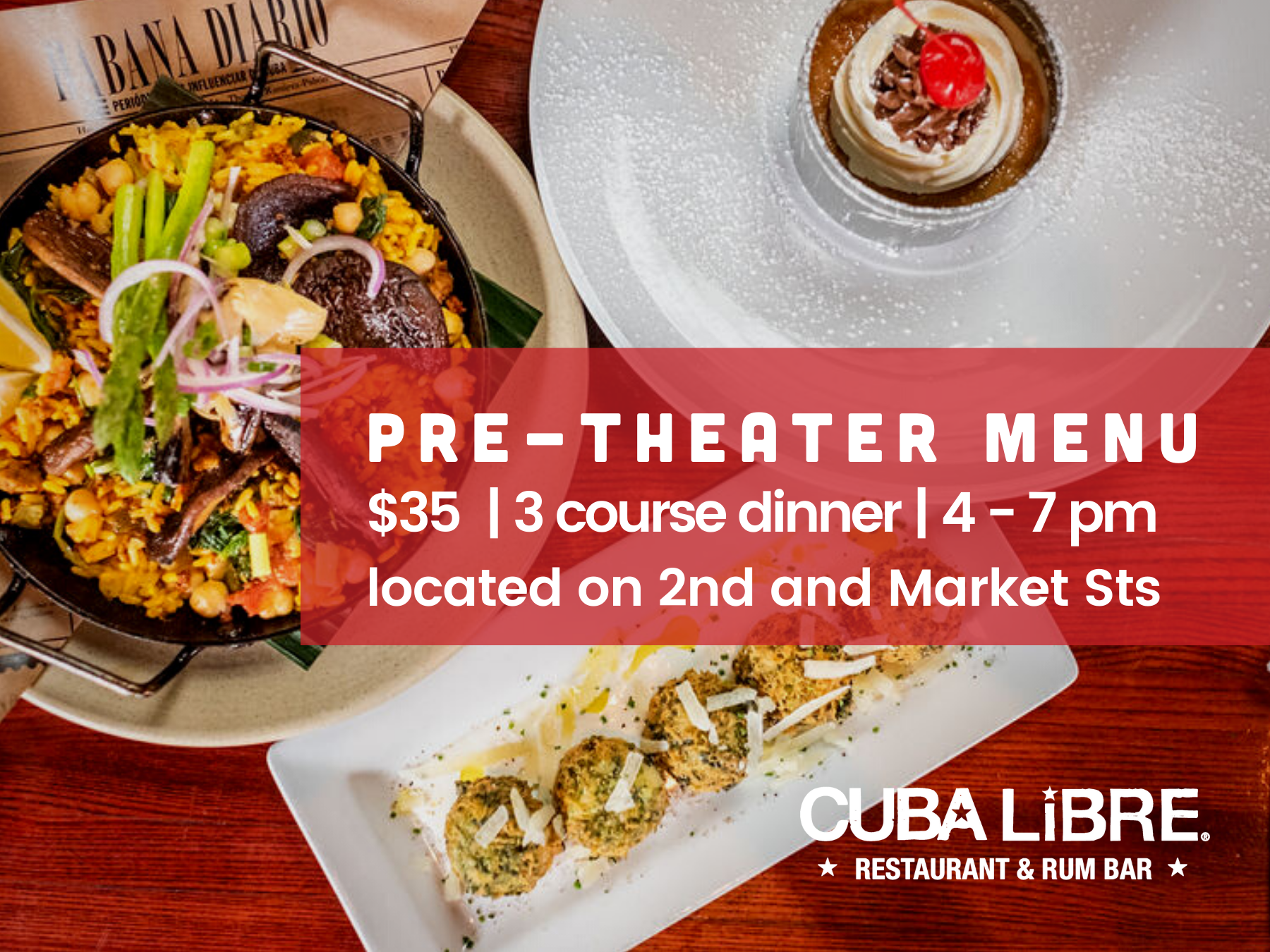 Cuba Libre Restaurant & Rum Bar, located at 2nd & Market Streets, is dedicated to a continued exploration of Cuban heritage, art, music, flavors and traditions. The open-air setting, tropical ambiance, vintage décor, Latin music and Founding Chef Guillermo Pernot's expansive menus of classic and contemporary Cuban cuisine make the restaurant a must-see, must-experience dining destination. Enjoy a signature mojito or caipirinha with your dinner, lunch or weekend brunch, or visit Cuba Libre for Happy Hour (Monday-Friday, 4:00-6:30pm) or late night dancing (Fridays and Saturdays after 11 PM). Planning a private event? Visit Cuba Libre’s website to learn about the different event spaces, party enhancements, and customizable menus.