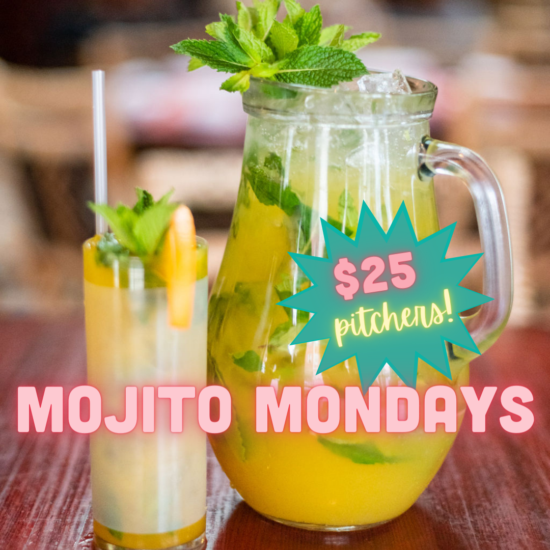 EVERY Monday is Mojito Monday with pitcher specials! Classic mojito and sangria pitchers for $25, flavored mojitos pitchers for $30 offered all day, at the bar and in the dining room. Plus, non-alcoholic “no-jito” pitchers for $15. Pitchers serve 6!