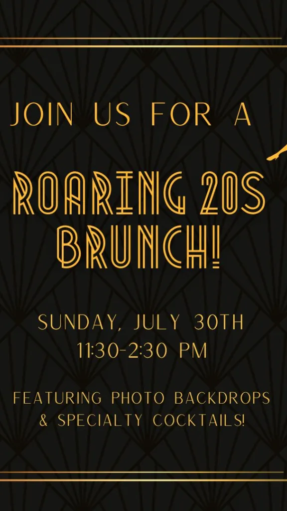 Join us for our monthly theme brunch: A Roaring 20s Gatsby Brunch! Sunday, July 30th from 11:30-2:30. Featuring specialty drinks and photo backdrops. It will be a roaring good time!