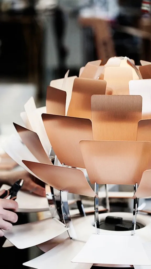 When Henningsen designed the iconic PH Artichoke for the Langelinie Pavillonen restaurant in Copenhagen in 1958, he opted for solid copper leaves with a rose finish on the leaves' interiors. This combination lent an exceptional warmth to the lamp's organic form and beautifully reflected the light from its hidden source. The PH Artichoke creates soft, glare-free illumination, with its complex design and structure ensuring that the light breaks and filters evenly into the room.