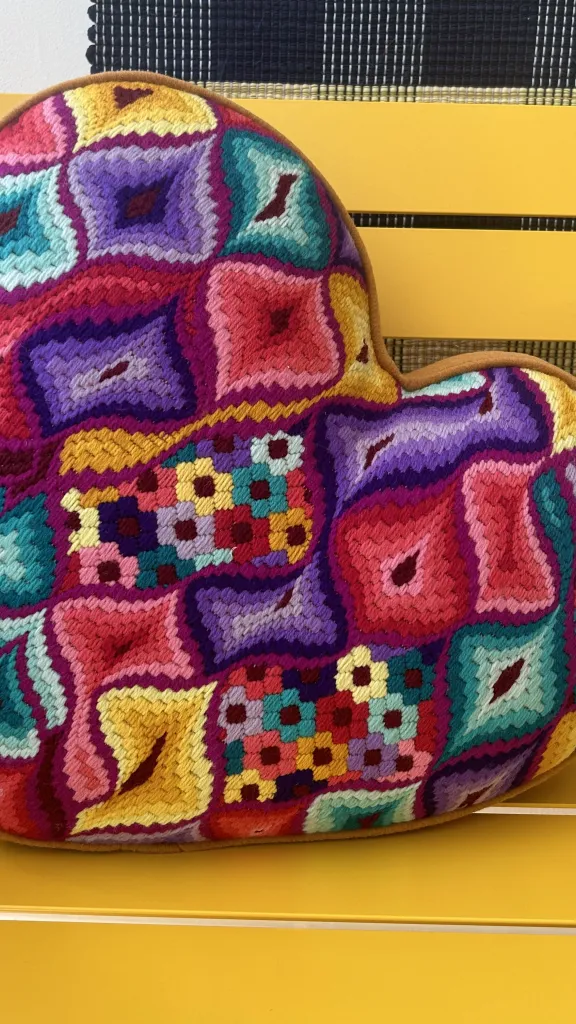 Nancy Lisagor Philadelphia artist will be showing her hyper color bargello pillows hand stitched with wool yarns.