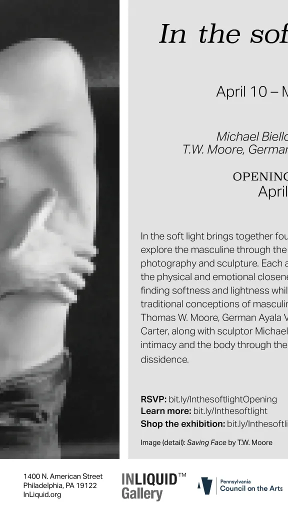 In the Soft Light brings together four artists who explore the masculine through the soft light of photography and sculpture. Each artist delves into the physical and emotional closeness between men, finding softness and lightness while challenging traditional conceptions of masculinity. Photographers Thomas W. Moore, German Ayala Vazquez, and Robert Carter, along with sculptor Michael Biello, examine intimacy and the body through the lens of sexual dissidence.