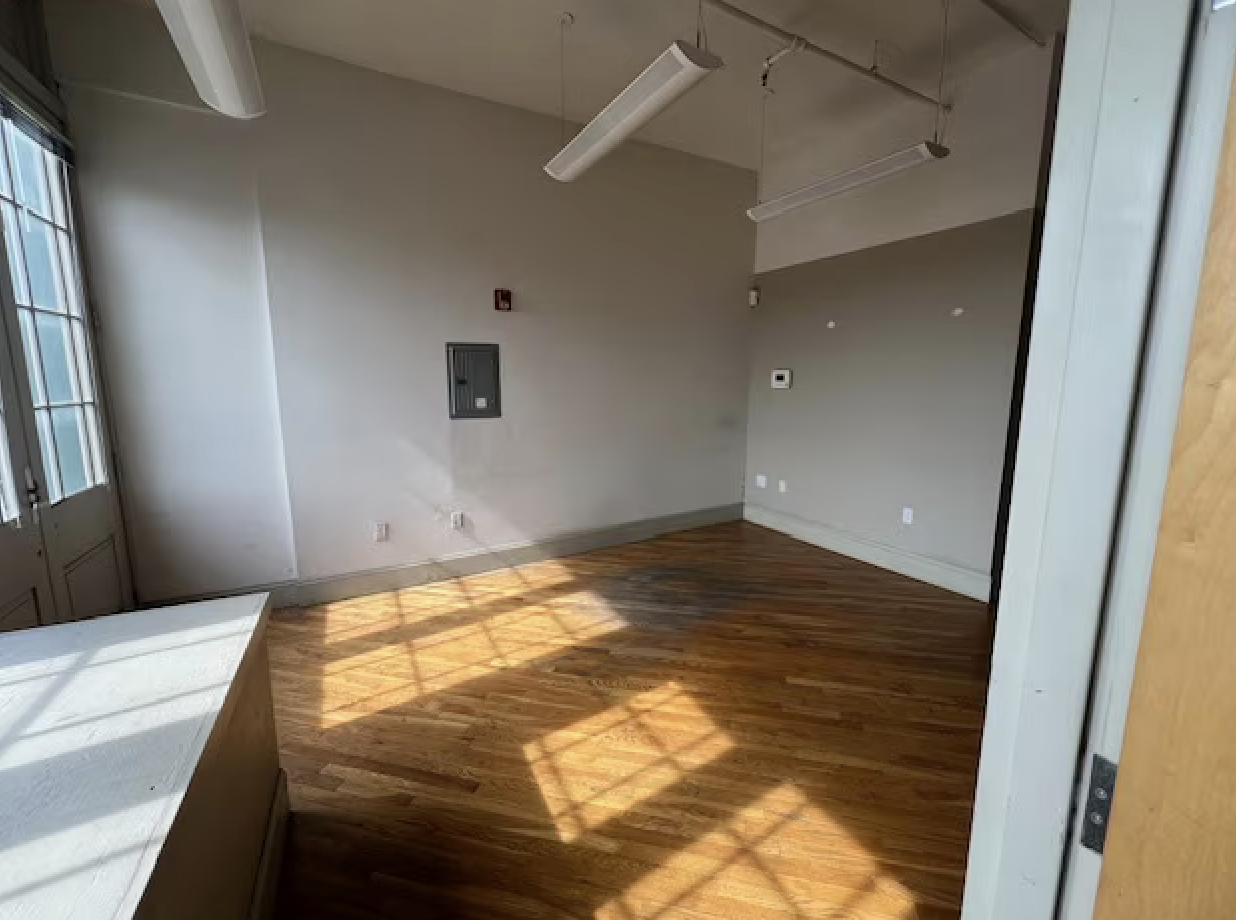 This 1st floor walk in space leads to the reception area and has hardwood floors throughout with high ceilings. It is well lit with natural light and includes a kitchen and closet for storage. The space features a large open conference room and acecss to a rear outdoor deck. It is suitable for various uses including medical/office, fitness studio, and many others.